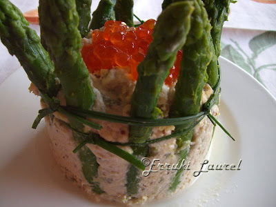 - En la fuente o plato donde vamos a servir y dentro de un aro, ponemos los espárragos por fuera rellenando el resto con el paté. Apretar un poquito con el dorso de una cuchara igualando el conjunto.